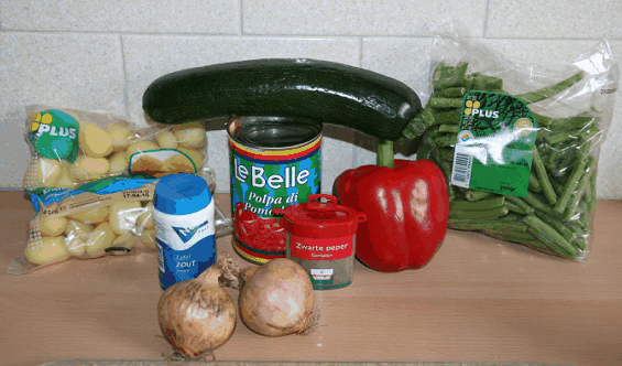 - Paprika, ui en courgette (in kleine stukjes gesneden) toevoegen en zachtjes laten