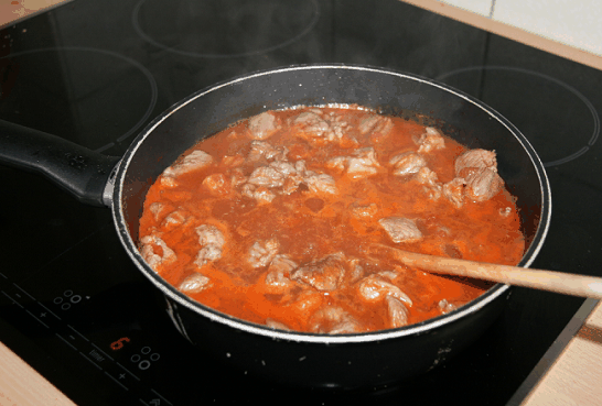 - Tomaten, oregano en laurier toevoegen en het lamsvlees 45 minuten laten sudderen.