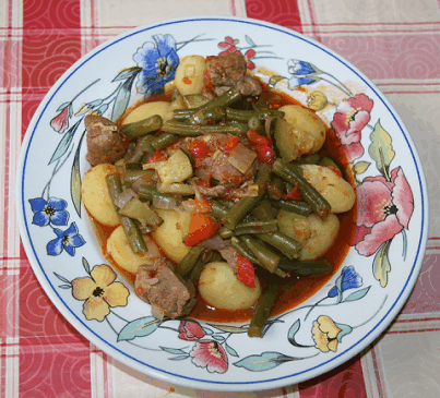 - Boontjes en aardappels toevoegen en 5 minuten laten sudderen.